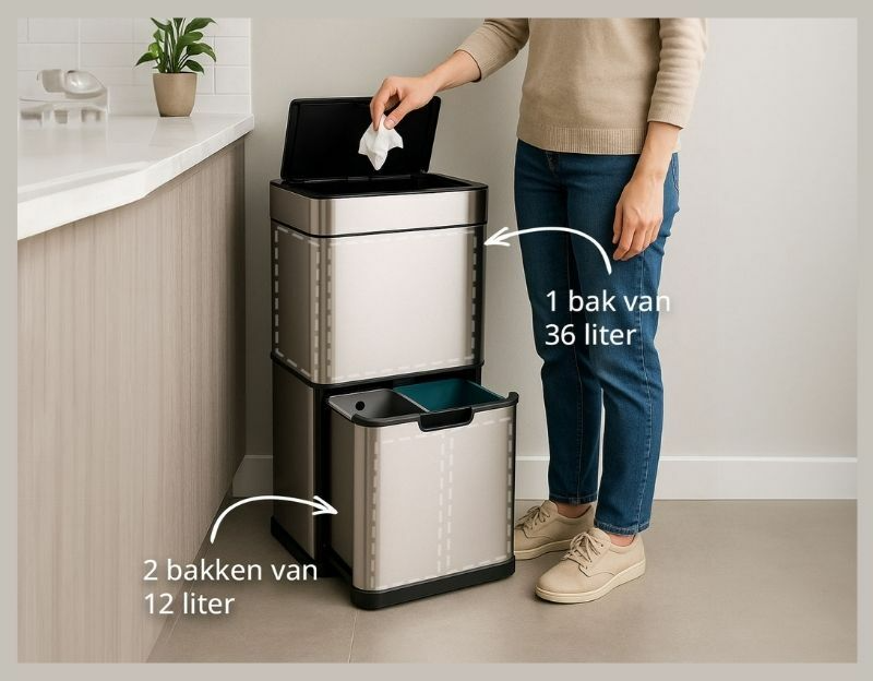 | Deze prullenbak met automatische sensor en drie handige compartimenten maakt afvalbeheer eenvoudig, hygiรซnisch en overzichtelijk. Grote inhoud, strak design en maximaal gemak in รฉรฉn slimme oplossing.