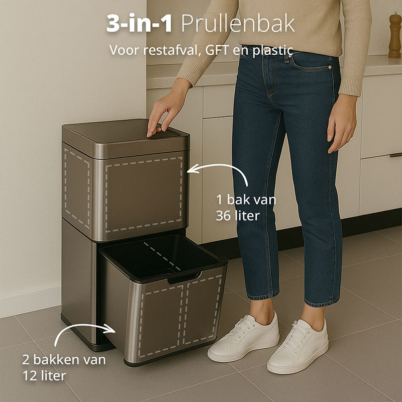 | Dé stijlvolle en slimme prullenbak die jouw afvalbeheer naar een hoger niveau tilt. Dankzij zijn grote inhoud, automatische sensor en handige indeling met drie compartimenten is deze design prullenbak perfect voor wie gemak, hygiëne én duurzaamheid belangrijk vindt.