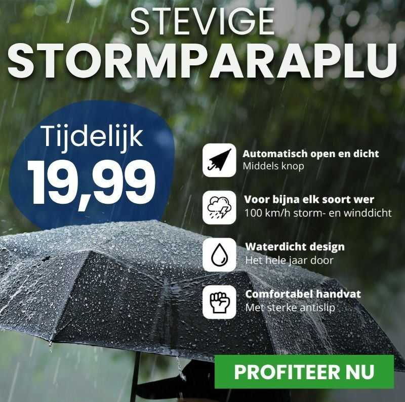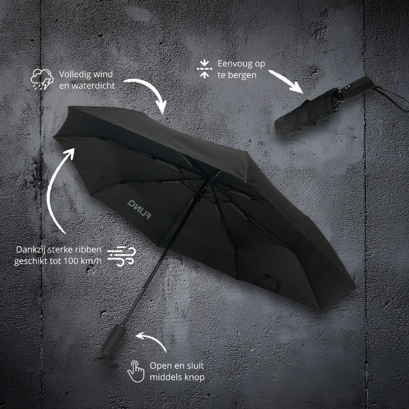 Deze stevige, windbestendige paraplu is bestand tegen windstoten tot 100 km/u en heeft een automatisch open- en sluitsysteem wat ervoor zorgt dat je de paraplu razendsnel gebruikt, zelfs als het stormt.