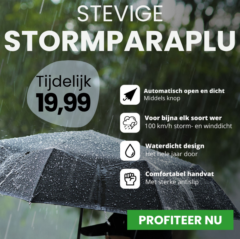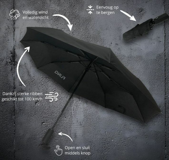 Deze stevige, windbestendige paraplu is bestand tegen windstoten tot 100 km/u en heeft een automatisch open- en sluitsysteem wat ervoor zorgt dat je de paraplu razendsnel gebruikt, zelfs als het stormt.