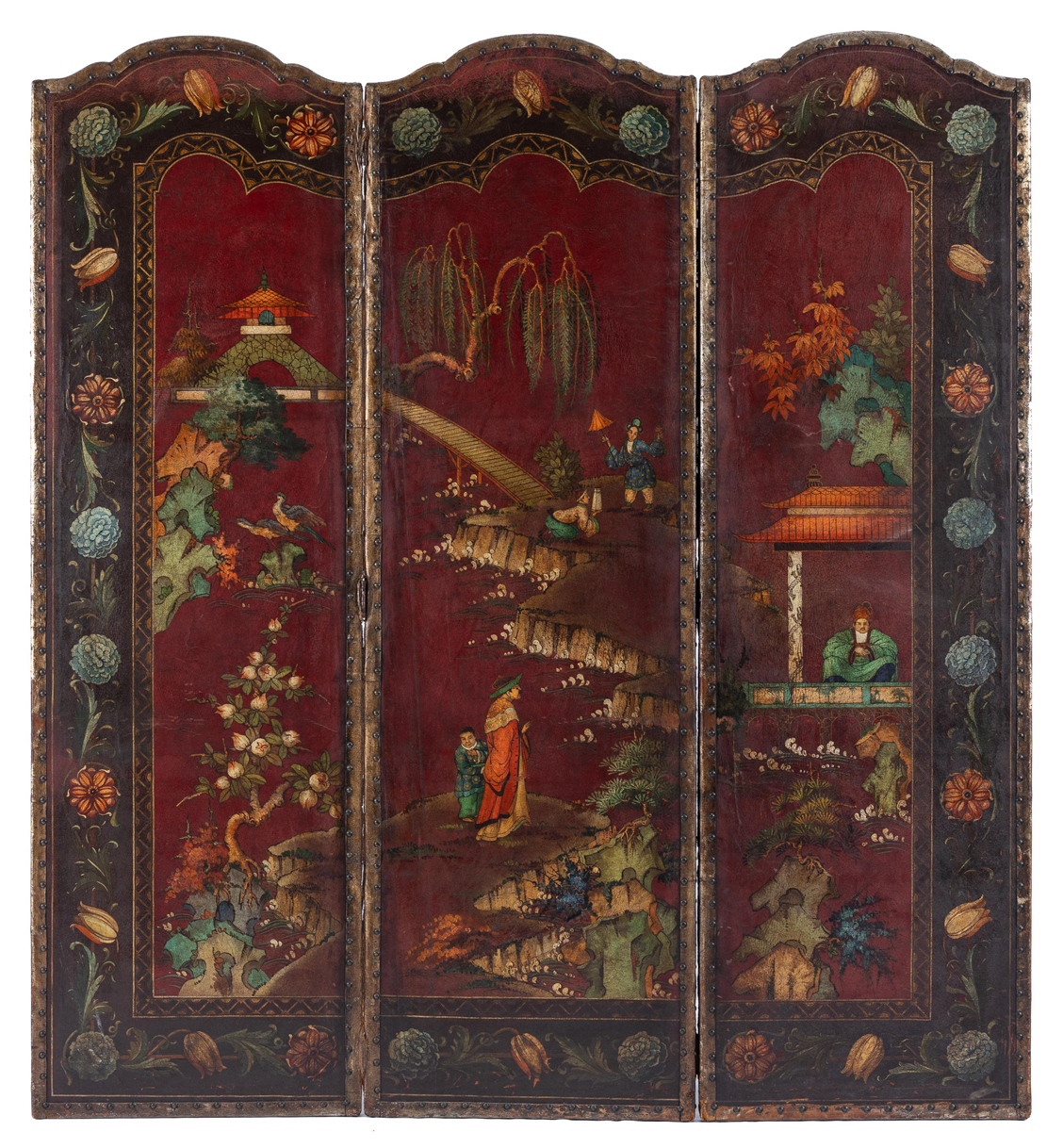 10. Antique three panel Chinese hand painted leather screen