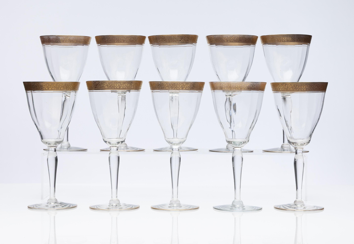 55. Set of 10 vintage crystal goblets with gilt & acid etched floral rims