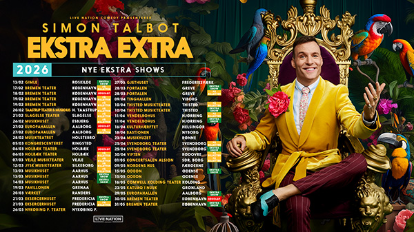 Talbot kan opleves i hele Danmark i de kommende måneder, og der er netop sat flere shows i salg EKSTRA EXTRA! Danmarksturnéen. |