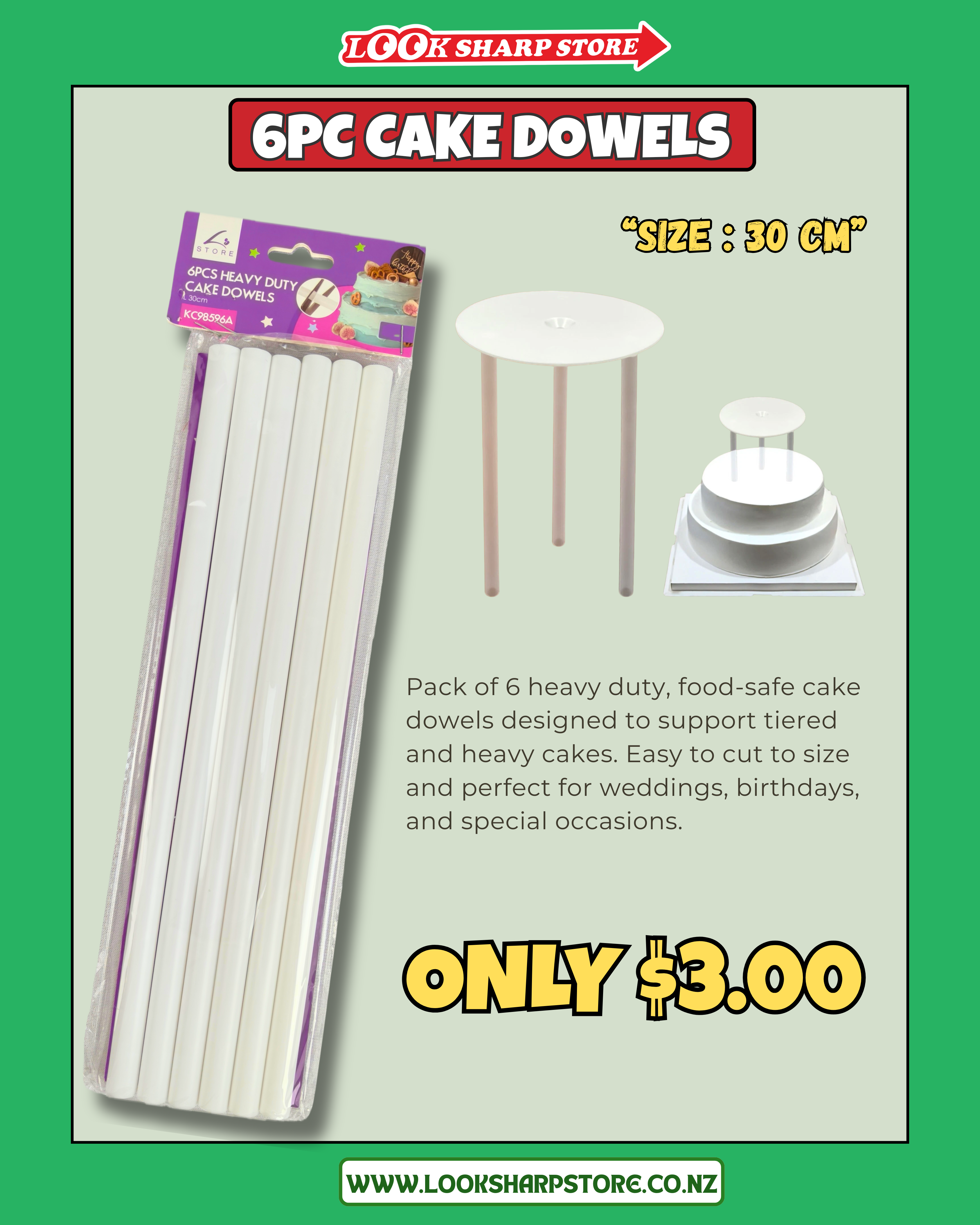 Heavy-duty, food-safe cake dowels (30cm) — perfect for weddings, birthdays & more. Just $3 for a 6-pack!