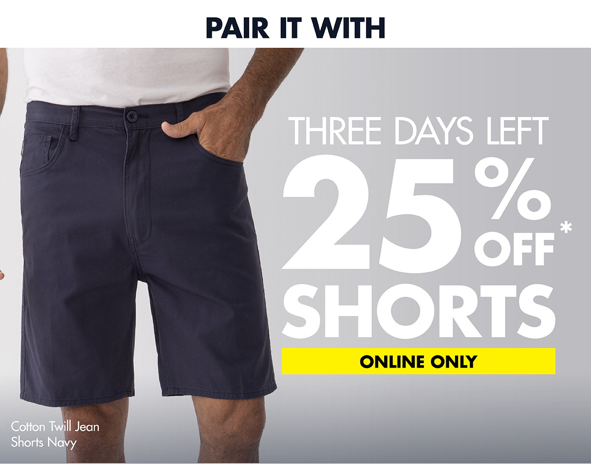T&C's Apply. 25% Off* Shorts is available online only and ends 11:59pm 8/2/2026. Discounts apply to original prices, not markdown prices. Discounts apply to selected styles in linked categories only. Cannot be used in conjunction with any other offer. No rainchecks. The prices in this email apply only to the products shown in the image and not to other colours or styles unless stated otherwise. Styles may vary from store to store. While stock lasts. Please choose carefully. Refund only with receipt. See full terms and conditions here. Don't want to receive
