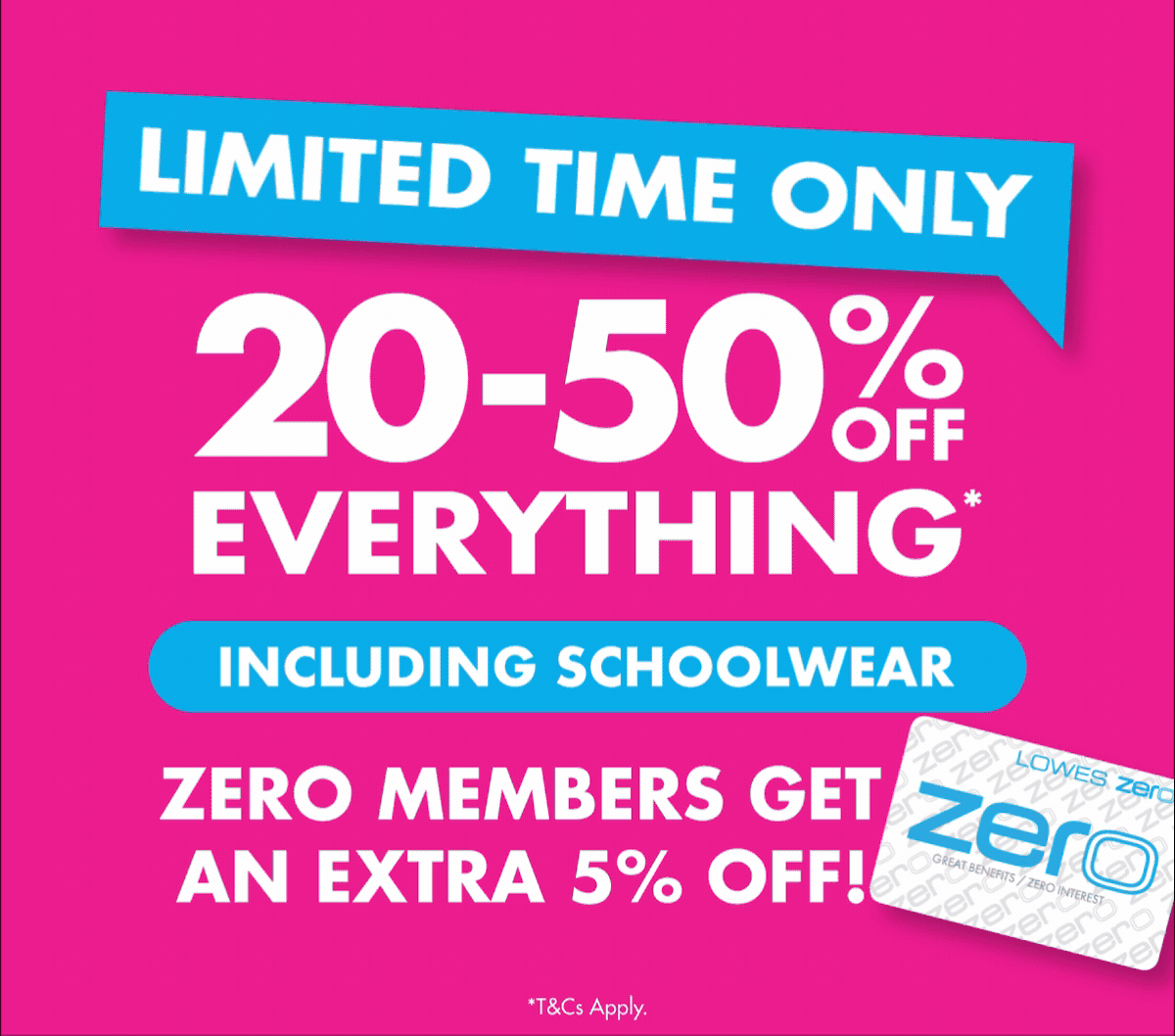 *T&Cs Apply. 20-50% Off Sale ends 11:59pm Sunday 8th March 2026. Discounts apply to original prices, not markdown prices. To receive extra 5% discount, payment must be made using Zero card. Discounts apply to selected styles in linked categories only. Excludes gift cards, Gradwear, 'Learn our Land' interactive apparel & lay-bys. Cannot be used in conjunction with any other offer. No rainchecks. The prices in this email apply only to the products shown in the image and not to other colours or styles unless stated otherwise. Styles may vary from store to store. While stock lasts. Please choose carefully. Refund only with receipt. See full terms and conditions here. Don't want to receive
