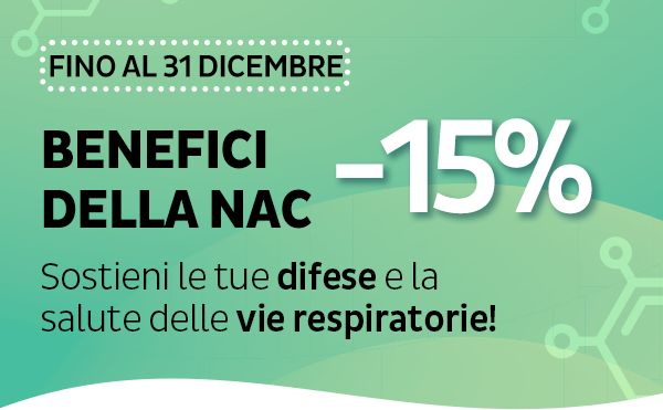 Fino al 31 dicembre potrai beneficiare di uno sconto esclusivo del 15% valido sugli integratori con N-Acetilcisteina (NAC) selezionati. |