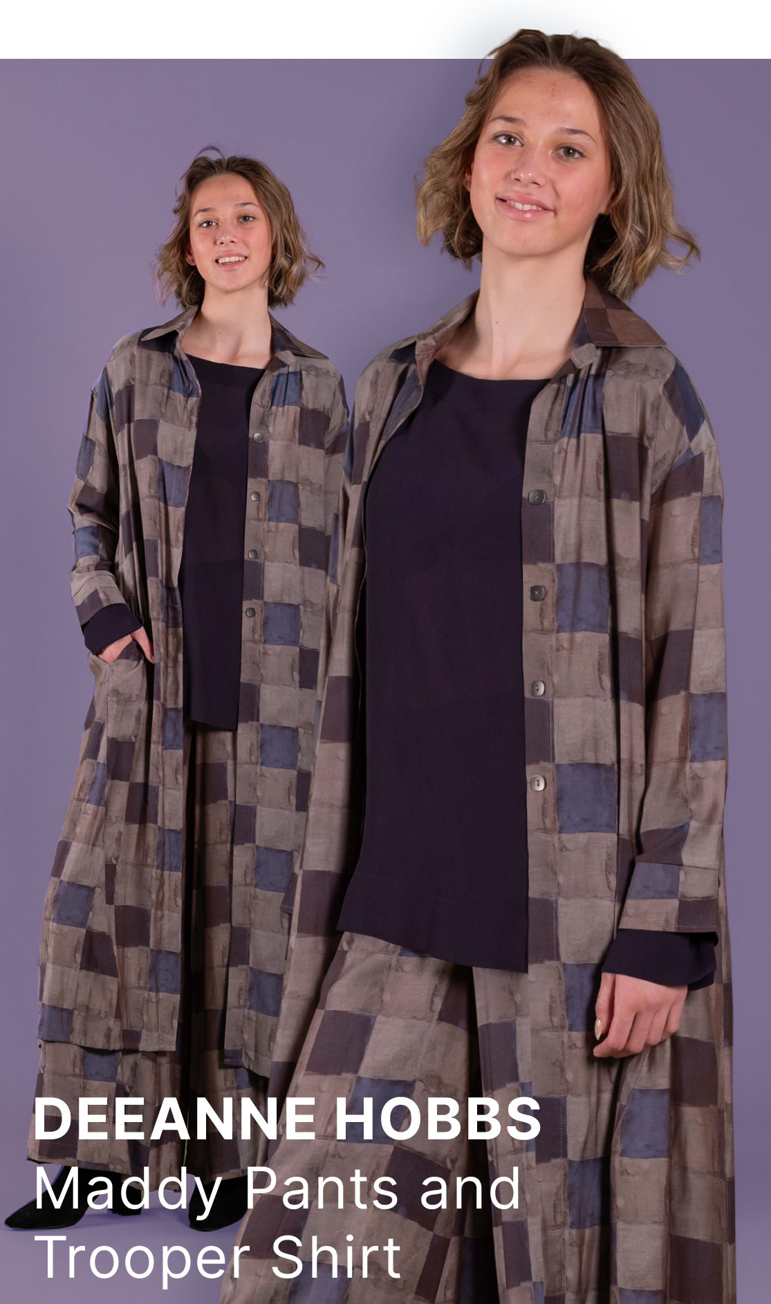 Deeanne Hobbs brings a painterly checkerboard effect to these pieces, in a muted and intriguing palette of Greige, Aubergine, and Violet.