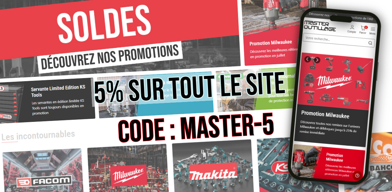 Dans le cadre du lancement de notre nouveau site Master-Outillage, nous avons eu le plaisir de vous offrir le code promotionnel MASTER-5, vous permettant de bénéficier de 5% de remise sur l’ensemble du site (hors articles déjà en promotion)
