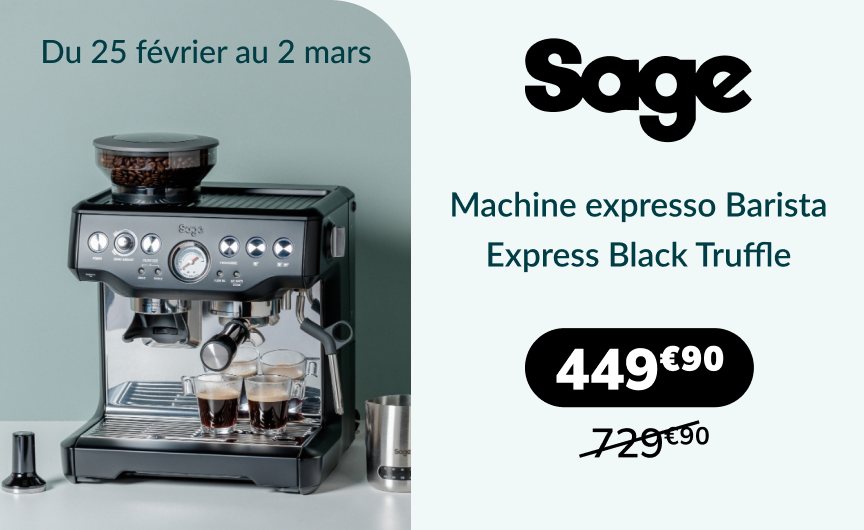 **Offre limitée à une 1 utilisation par personne, valable uniquement sur le site www.maxicoffee.com avec votre code 26BD280, jusqu'au 2 mars 2026 - minuit, BLACK DEAL SAGE sur la machine La Barista Express Black Truffle de la marque Sage, voir conditions sur le site. Sans l’indication d'un code, l’offre ne pourra être appliquée. Offre non cessible, non remboursable, non échangeable.