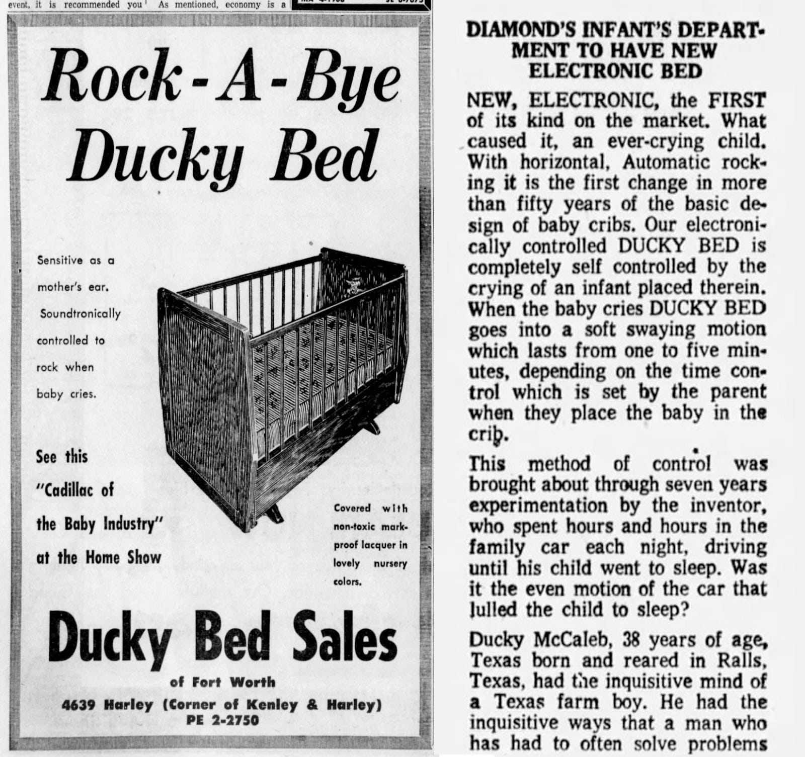 You never know where a story will find you - or where it will take you. Hey, Jason Toon here, with Shoddy Goods, the newsletter from Meh about consumer culture. This week, a curious old radio commercial leads through the West Texas plains to a tall tale of lost treasure, with one mysterious figure in the middle of it all. A young man with big dreams and a lot of court dates ahead of him, 1949 I was listening to a recording on YouTube of a 1957 radio broadcast from Lubbock, Texas, because that’s the kind of weird thing I do. Right after the Four Esquires’ “Love Me Forever”, a lullaby of a commercial promised “Your baby will sleep as peacefully as a Christmas angel when he sleeps in a Ducky Bed.” This wasn’t just a pitch for a comfy mattress. With a sound sensor “as sensitive as a mother’s ear”, the Ducky Bed “hears the [baby’s] cry and begins to gently rock the baby to sleep.” This parenting Godsend was “manufactured in Lubbock for babies all over the world.” OK, a cry-detecting self-rocking bed, that’s the kind of oddity I can build a Shoddy Goods around. I figured there had to be more to the company and the invention. For all I knew, Ducky Bed had grown into a household name, and spawned a whole category of sob-triggered swaying cribs. This was just one random radio recording from 1957, out of billions of hours of radio that have ever been broadcast, that I happened to stumble across on YouTube. Statistically, what were the chances this product was a weird local one-off? Turns out that’s exactly what it was. I could only rustle up scant traces of historical evidence of the Ducky Bed. But its namesake inventor, Cloyce Leon “Ducky” McCaleb, left his own record behind - largely of the criminal variety. “Cadillac of the Baby Industry” To hear the Diamond Department Store tell it in a 1957 ad in the Arizona Republic, the Ducky Bed was the product of “the inquisitive mind of a Texas farm boy.” They spun a tale straight out of Horatio Alger, about a plucky 38-year-old back-country genius by the colorful name of Ducky McCaleb experimenting for years to bring sweet relief to bedraggled parents everywhere. It’s all in there: his childhood improvising solutions on the farm with whatever junk was at hand… his tortured nights driving his wailing baby son around to get him to sleep… his first clunky contraptions of springs, belts, and scavenged engine parts. So soundtronic, you guys It sounds like a good idea. For about two seconds. Until you consider that new parents, the most paranoid creatures on Earth, may not be wild about putting their precious, vulnerable baby inside a runaway shaking machine, even a “soundtronically controlled” one that calls itself the “Cadillac of the Baby Industry”. But maybe parents weren’t the ultimate audience. In other ads seeking potential investors, McCaleb’s co-founder Charlie Moore offered franchises starting at $5,000, “depending on the territory granted”. The ad claimed Ducky Bed already had “successful dealerships now in operation”. Not that successful, apparently. Or, more likely, nonexistent. Just months later, in May of 1958, Ducky Bed filed for bankruptcy. An auction that July offered the 134 working Ducky Beds still in stock, the company’s production and office equipment - and the patent to the Ducky Bed. “An acorn company with oak tree ideas” But you can’t keep a good-sounding idea down. Splashed across the front page of the Paris, Texas News on December 11, 1960 was a banner headline proclaiming that Paris had landed a new plant for a company called Roka-Bed, led by none other than C.L. McCaleb and Charlie Moore. I guess nobody bought that patent. Moore told the paper that Roka-Bed - “an acorn company with oak tree ideas” - would “consolidate” its “subsidiary operations in several Texas cities” into a 35,000-square-foot former potato chip factory, housing “50 or more employees initially”. The piece listed the many products of McCaleb’s “keen inventive mind” that Roka-Bed manufactured and distributed, from baby beds and baby bottles to “portable shower cabinets for hospitals” and “electronically automatic irrigation systems”. Hmmm. Really? I can’t say Roka-Bed didn’t have operations all over Texas, and couldn’t possibly have hired 50 people. I’m not saying, definitively, that they never manufactured a single shower cabinet or irrigation system. You can’t prove a negative. I am saying that I couldn’t find a shred of evidence that they ever did any of that. For all the big talk in this piece, it was all the Paris News would ever say about Roka-Bed. We’ll never have Paris. Moore and McCaleb are third and fourth from left in the photo A functioning, 50-strong small-town manufacturing firm would pop up in the local paper now and then, in news stories, want ads, legal notices, something. A company pumping out a wide range of innovative devices would attract attention from the likes of Popular Mechanics. A Roka-Bed that did half of what Moore described would leave traces. It didn’t. There’s one thing Moore and McCaleb were known for doing with the company: illegally selling stock in it. In 1963, they were charged with violations of the Securities Act for peddling unregistered shares of Roka-Bed to at least 19 fellow Lubbockites. The following year McCaleb was at it again, allegedly hawking unofficial stock in a whole new venture called Auto-Relaxor that made even less impression on the historical record. It starts to look like the Ducky Bed was less a way to rock babies to sleep, and more a vehicle for McCaleb and Moore to siphon cash from credulous, perhaps sleep-deprived backers. Did they stage the whole Paris hullabaloo as a show for impatient investors wondering what their money was going? At this point, I was still giving McCaleb the benefit of the doubt. He seemed to me an understandable figure, maybe even a sympathetic one: the st