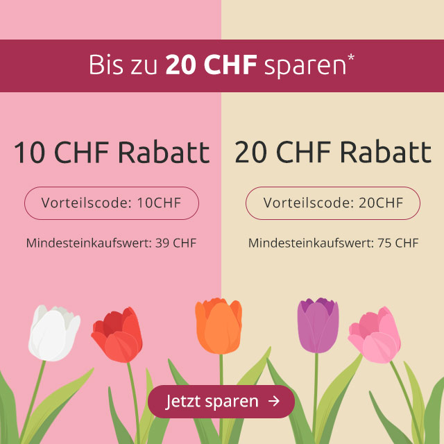 *Ihr Gutschein ist einmalig gültig bei einer Bestellung bis zum 06.04.2026. Bei einem Mindesteinkaufswert von 39 CHF erhalten Sie einen Gutschein in Höhe von 10 CHF, bei einem Mindesteinkaufswert von 75 CHF erhalten Sie einen Gutschein in Höhe von 20 CHF. Keine Barauszahlung. Die Aktion ist nicht übertragbar und kann nicht in Verbindung mit anderen Aktionen oder bei Kooperationspartnern eingelöst werden. Die Vorteilsnummer muss bei der Bestellung angegeben werden. Bei Unterschreitung des Mindesteinkaufswertes durch Widerruf behalten wir uns das Recht vor, den Gutschein zu stornieren. Der Wert von nicht zurückgesendeten Waren ist in diesem Fall in voller Höhe zu bezahlen. Der Gutschein kann nicht auf bereits getätigte Bestellungen gewährt werden. Geschenk-Gutscheine, Bücher sowie Zeitschriften sind von der Aktion ausgenommen.