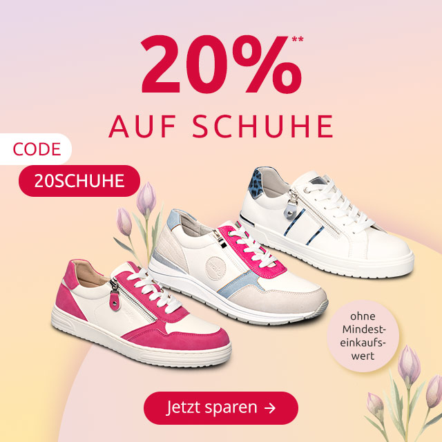 **Ihr 20 % Rabatt ist nur einmalig gültig bei einer Bestellung bis zum 01.02.2026. Keine Barauszahlung. Der Rabatt gilt nur für Produkte aus der Kategorie „Schuhe“. Die Aktion ist nicht übertragbar und kann nicht in Verbindung mit anderen Aktionen oder bei Kooperationspartnern eingelöst werden. Die Vorteilsnummer muss bei der Bestellung angegeben werden. Der Rabatt kann nicht auf bereits getätigte Bestellungen gewährt werden. Geschenk-Gutscheine, Bücher und Zeitschriften sind von der Aktion ausgenommen.