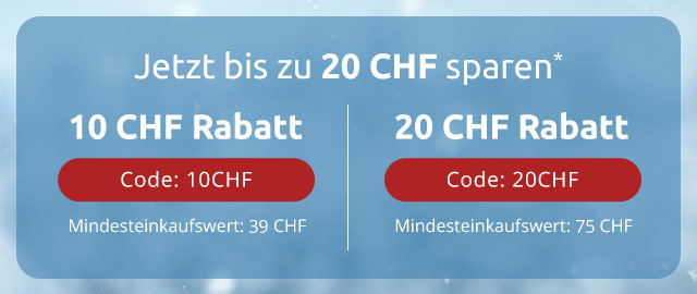 *Ihr Gutschein ist einmalig gültig bei einer Bestellung bis zum 29.01.2026. Bei einem Mindesteinkaufswert von 39 CHF erhalten Sie einen Gutschein in Höhe von 10 CHF, bei einem Mindesteinkaufswert von 75 CHF erhalten Sie einen Gutschein in Höhe von 20 CHF. Keine Barauszahlung. Die Aktion ist nicht übertragbar und kann nicht in Verbindung mit anderen Aktionen oder bei Kooperationspartnern eingelöst werden. Die Vorteilsnummer muss bei der Bestellung angegeben werden. Bei Unterschreitung des Mindesteinkaufswertes durch Widerruf behalten wir uns das Recht vor, den Gutschein zu stornieren. Der Wert von nicht zurückgesendeten Waren ist in diesem Fall in voller Höhe zu bezahlen. Der Gutschein kann nicht auf bereits getätigte Bestellungen gewährt werden. Geschenk-Gutscheine, Bücher sowie Zeitschriften sind von der Aktion ausgenommen.