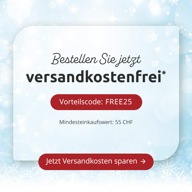 *Sie erhalten die Gutschrift der Versandkosten ab einem Mindesteinkaufswert von 55 CHF einmalig bei einer Bestellung bis zum 27.11.2025. Frachtkosten sind hiervon ausgenommen. Keine Barauszahlung. Die Aktion ist nicht übertragbar und kann nicht in Verbindung mit anderen Aktionen oder bei Kooperationspartnern eingelöst werden. Die Vorteilsnummer muss bei der Bestellung angegeben werden. Die Gutschrift kann nicht auf bereits getätigte Bestellungen gewährt werden.