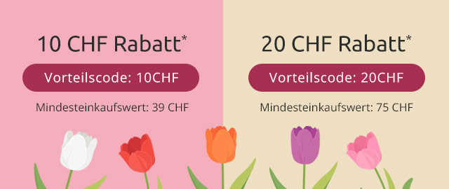 *Ihr Gutschein ist einmalig gültig bei einer Bestellung bis zum 06.04.2026. Bei einem Mindesteinkaufswert von 39 CHF erhalten Sie einen Gutschein in Höhe von 10 CHF, bei einem Mindesteinkaufswert von 75 CHF erhalten Sie einen Gutschein in Höhe von 20 CHF. Keine Barauszahlung. Die Aktion ist nicht übertragbar und kann nicht in Verbindung mit anderen Aktionen oder bei Kooperationspartnern eingelöst werden. Die Vorteilsnummer muss bei der Bestellung angegeben werden. Bei Unterschreitung des Mindesteinkaufswertes durch Widerruf behalten wir uns das Recht vor, den Gutschein zu stornieren. Der Wert von nicht zurückgesendeten Waren ist in diesem Fall in voller Höhe zu bezahlen. Der Gutschein kann nicht auf bereits getätigte Bestellungen gewährt werden. Geschenk-Gutscheine, Bücher sowie Zeitschriften sind von der Aktion ausgenommen.