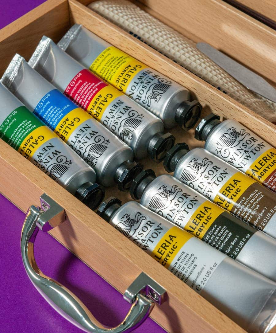Questa elegante cassetta in legno racchiude tutto l’essenziale per immergersi nel mondo della pittura acrilica. La differenza rispetto ai colori visti finora è che questi sono acrilici Galeria di Winsor&Newton.