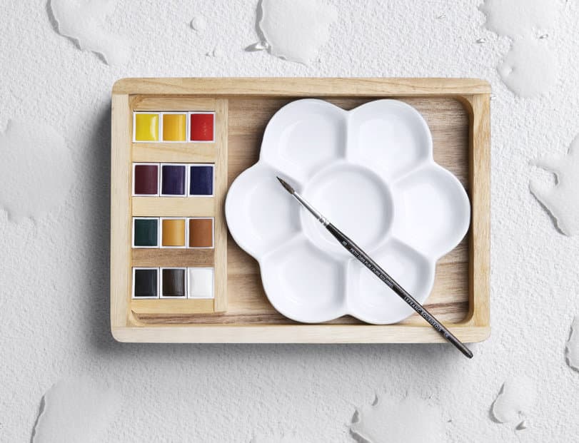 Si tratta di un cassettina in legno con 12 mezzi godet, un pennello per acquerello misura 8 e una tavolozza in ceramica.