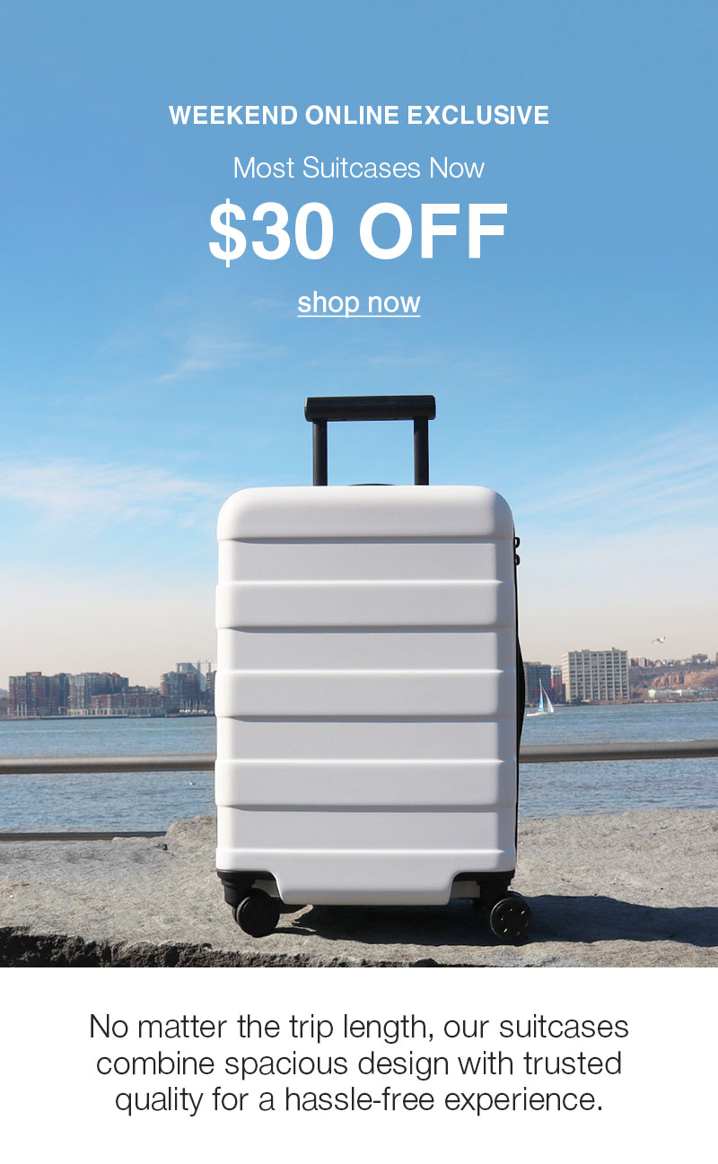 $30 Off Select Suitcases is valid online only at MUJI.us until 5/12/25 through 11:59 PM PT. Clearance items are final sale. Final sale items are non-returnable and non-exchangeable. Terms and conditions are subject to change, and offers may end without notice.