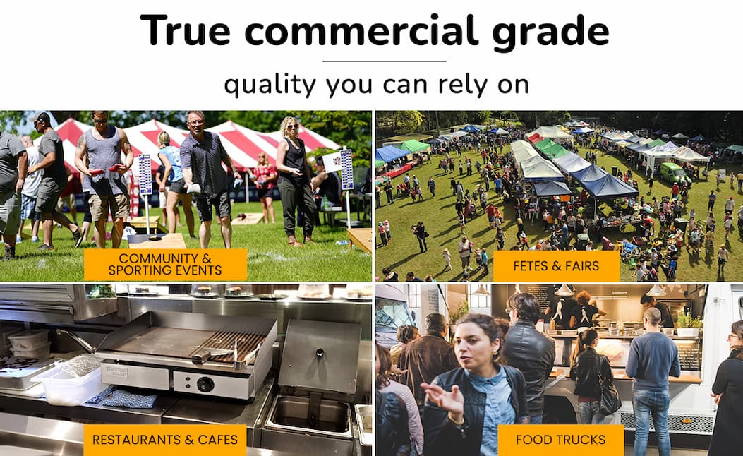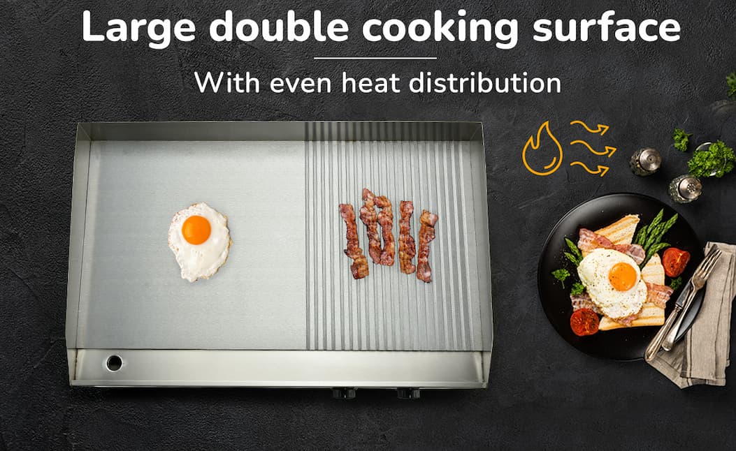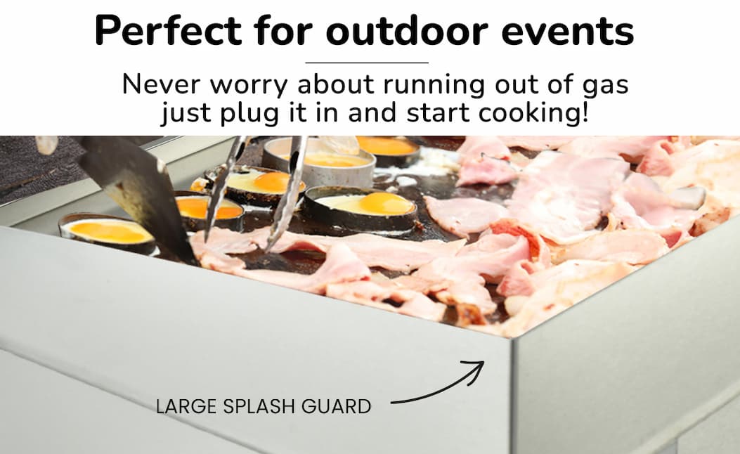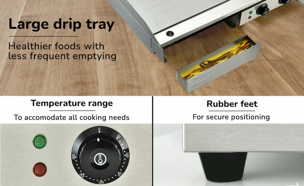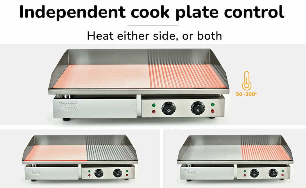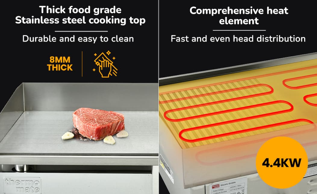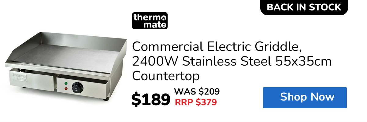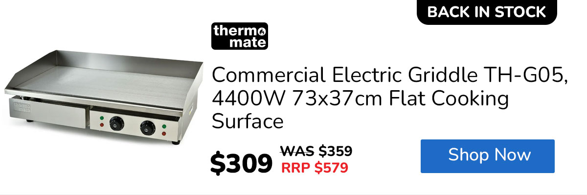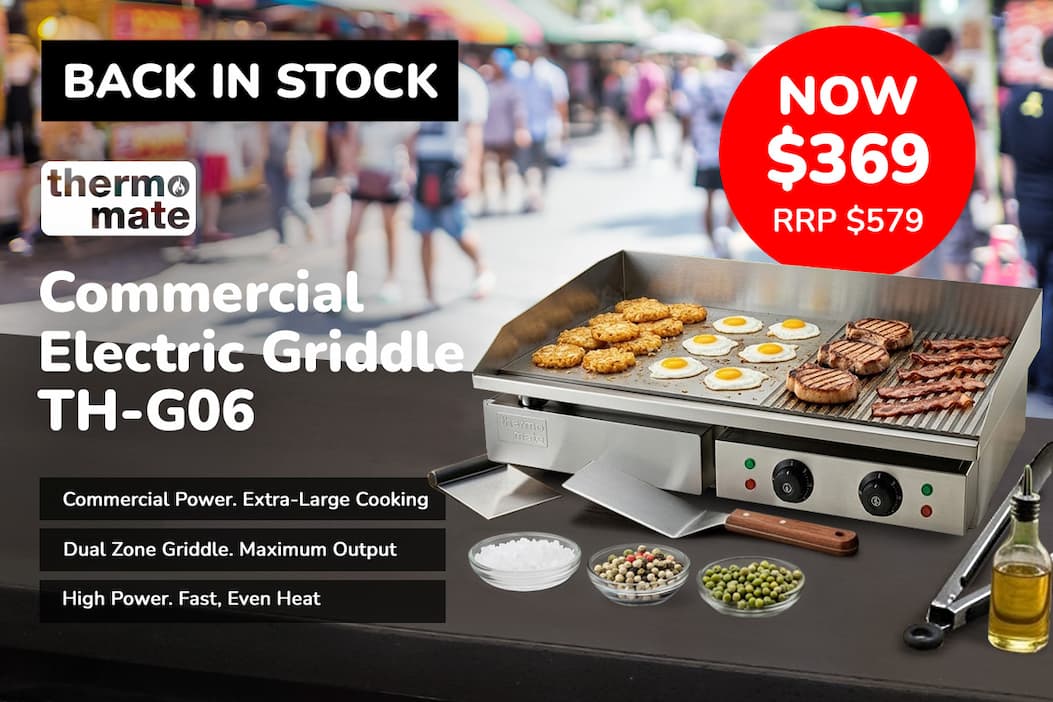 It’s back and ready to fire up your kitchen—this extra-large Thermomate Commercial Electric Griddle delivers powerful 4.4kW heating, dual-zone temperature control, and a versatile flat + ribbed cooking surface so you can cook everything from steaks to pancakes at once, while the thick 8mm iron plate ensures fast, even heat and the spacious 73x40cm surface lets you serve more in less time—don’t miss out again, stock is limited!