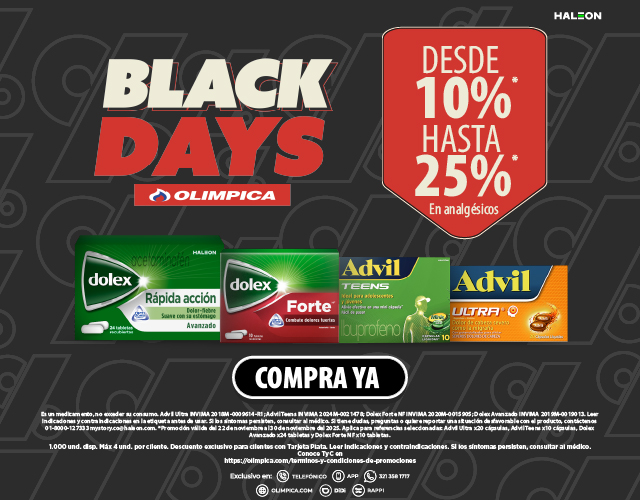 Precios y descuentos válidos en www.olimpica.com dentro de la vigencia establecida o hasta agotar existencias dentro de dicha vigencia (lo que suceda primero), y no son acumulables con otras promociones vigentes.