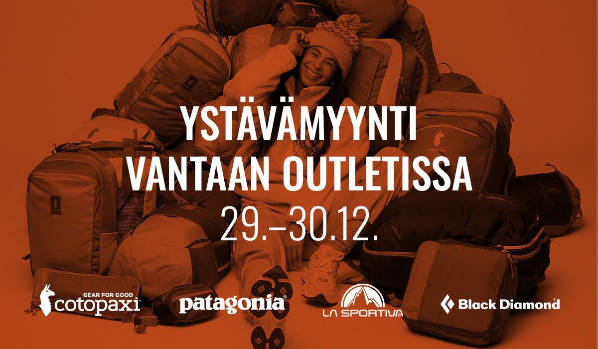 Ystävämyynti Vantaan Outletissa 29.–30.12. Tule tekemään laatulöytöjä huippumerkkien mallikappaleista. Mukana Cotopaxi, Patagonia, La Sportiva ja Black Diamond. Maahantuojan edustaja paikalla molempina päivinä. Lämpimästi tervetuloa!
