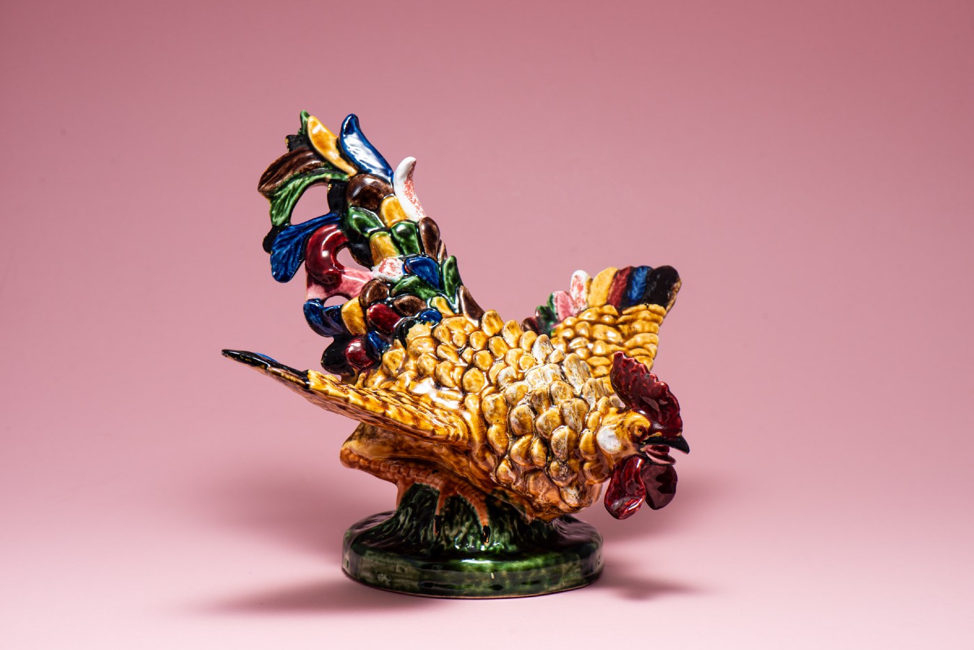 Rooster, glazed earthenware sculpture, manufactured in Caldas da Rainha. Partially embossed and hollow decoration in polychrome tones. Marked F. Mendes L. Gastos, with crackling and manufacturing defects.
