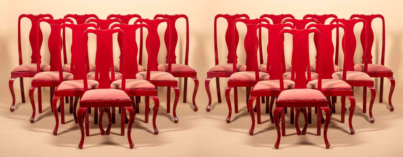 Set of 20 chairs painted red.
