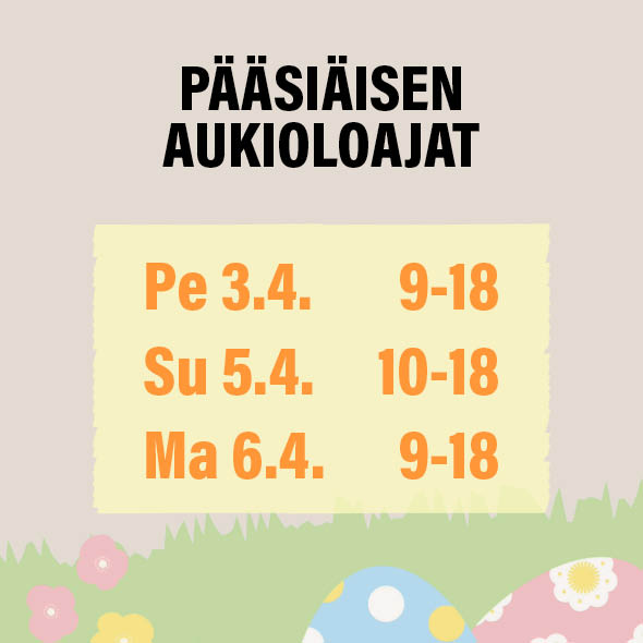 Pitkäperjantai 3.4. klo 9-18Pääsiäispäivä 5.4. klo 10-182. Pääsiäispäivä 6.4. klo 9-18