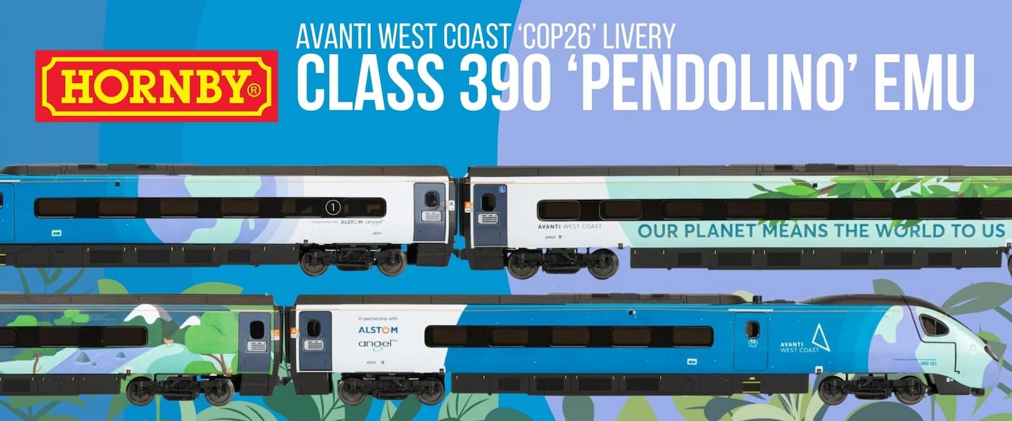 Arriving into stock is Hornby's whole range of Avanti West Coast Class 'Cop26' Liveried Class 390 'Pendolino' EMUs.