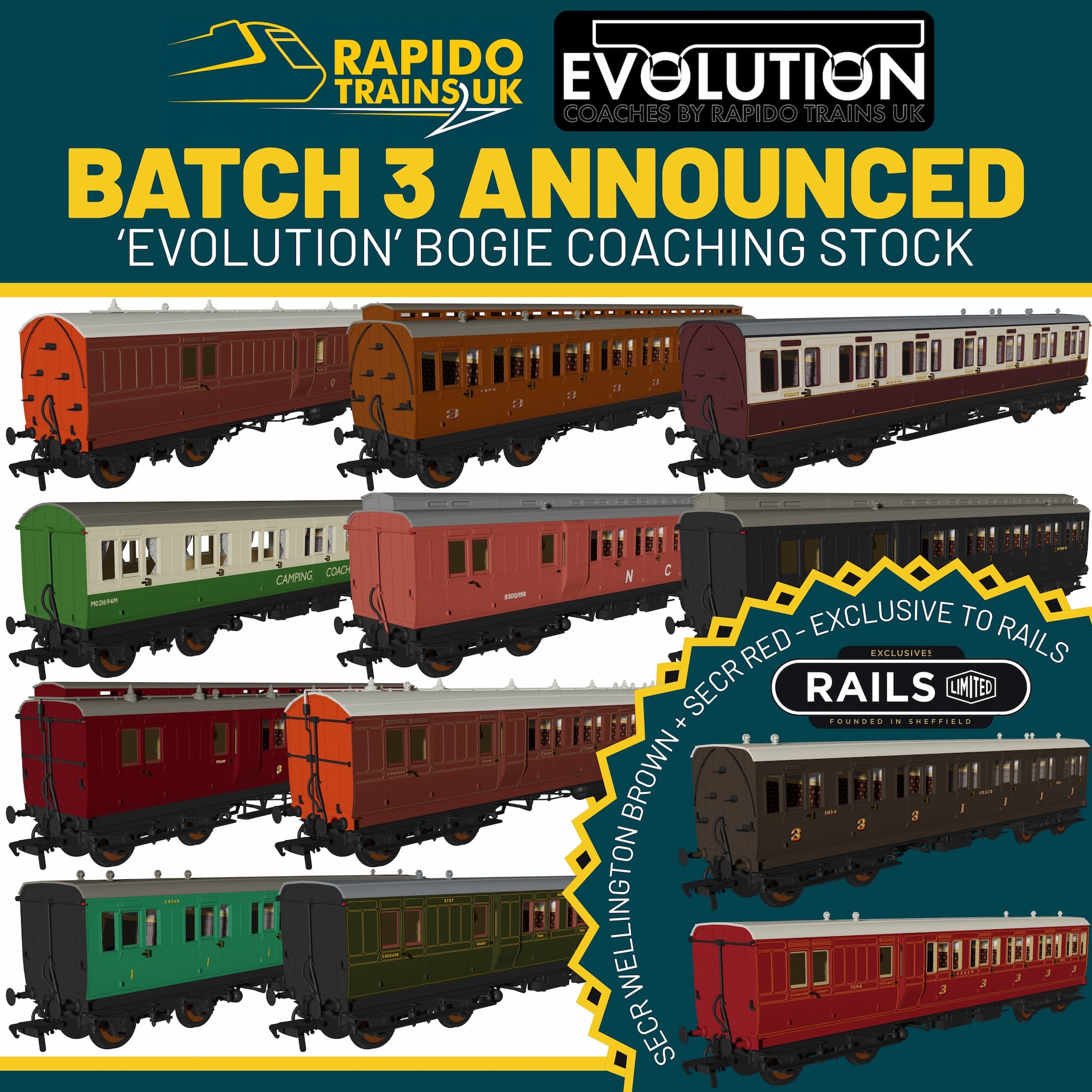 Rapido Trains UK have just announced a THIRD BATCH of their highly anticipated 'Evolution' Bogie Coaches in OO Gauge! This third run expand the range even further covering more of Britain's railway companies with some new options that haven't been covered in the range previously!
