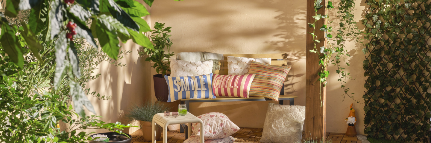 Een comfortabele loungeset + zachte kussens + sfeervolle decoratie = je eigen relaxplek buiten. Ontspannen maar!