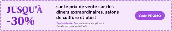 | | Nam Chai massage | | Soulagez le stress et les tensions avec Nam Chai massage | | Déjà 100 acheteurs | | 45,00 € Dès 29,99 € | | 28,49 € avec le code PROMO, Expire le 4.9 | | | |  | | RCS Company | | Entretien de chaudière au gaz avec RCS Company | | Déjà 100 acheteurs | | 140,00 € 79,99 € | | 75,99 € avec le code PROMO, Expire le 4.9 | | | | | | |  | | EBA ESTHETIK | | Lifting Coréen avec radiofréquence ou carbon laser glow ou soin HIFU | | 120,00 € Dès 72,00 € | | 68,40 € avec le code PROMO, Expire le 4.9 | | | |  | | Enjoy the moment | | Séance détente et beauté du corps avec Enjoy the moment | | Déjà 150 acheteurs | | 80,00 € Dès 49,99 € | | 47,49 € avec le code PROMO, Expire le 4.9 | | | | | | |  | | Foto Producten | | Maak je herinneringen onvergetelijk met deze geweldige fotoboeken | | Déjà 200 acheteurs | | 39,95 € Dès 5,99 € | | 5,69 € avec le code PROMO, Expire le 4.9 | | | |  | | Calm Spa | | Modelage aux pierres chaudes de 45 min | | Déjà 50 acheteurs | | 69,00 € Dès 39,99 € | | 37,99 € avec le code PROMO, Expire le 4.9 | | | | | | |  | | U Nice Place | | Séances de cryolipolyse | | lieux multiples | | Déjà 400 acheteurs | | | | |  | | Technipro Service | | Entretien de chaudière murale au gaz | | Déjà 1.000 acheteurs | | 120,00 € 79,99 € | | 75,99 € avec le code PROMO, Expire le 4.9 | | | | | | |  | | SmartFit&Hair | | Prestations coiffure homme/femme | | Déjà 450 acheteurs | | 25,00 € Dès 9,99 € | | 9,49 € avec le code PROMO, Expire le 4.9 | | | |  | | Boobo Italian Food | | Cuisine italienne | | Déjà 300 acheteurs | | 92,00 € Dès 54,99 € | | 52,24 € avec le code PROMO, Expire le 4.9 | | | | | | |  | | Smartfit | | Sessions palper-rouler mécanique | | Déjà 200 acheteurs | | 40,00 € Dès 24,99 € | | 23,74 € avec le code PROMO, Expire le 4.9 | | | |  | | Colorland | | Livre photo A4 de 28 à 100 pages avec Colorland | | Déjà 1.000 acheteurs | | 29,99 € Dès 8,99 € | | 8,54 € avec le code PROMO, Expire le 4.9 | | | | | | |  | | Serendip Spa, Yoga & Store | | Modelage au choix ou réflexologie | | Bruxelles, BRUXELLES | | Déjà 850 acheteurs | | 85,00 € Dès 54,99 € | | 52,24 € avec le code PROMO, Expire le 4.9 | | | |  | | Be Beautiful | | Lissage brésilien | | Bruxelles, BRUXELLES | | Déjà 200 acheteurs | | 90,00 € Dès 54,99 € | | 52,24 € avec le code PROMO, Expire le 4.9 | | | | | | |  | | Ollis Burgers Bar | | Formule hamburger au choix chez Olli's Burgers-Bar | | Dilbeek, VLAAMS-BRABANT | | Déjà 50 acheteurs | | 22,50 € Dès 13,99 € | | 13,29 € avec le code PROMO, Expire le 4.9 | | | |  | | Laserskinperfection | | Bruxelles : traitement de lifting par HIFU | | Déjà 50 acheteurs | | 135,00 € Dès 67,99 € | | 64,59 € avec le code PROMO, Expire le 4.9 | | | | | | |  | | Den Boomgaard | | Menu gastronomique au Den Boomgaard | | Déjà 100 acheteurs | | Dès 89,00 € | | 84,55 € avec le code PROMO, Expire le 4.9 | | | |  | | Bruma | | Powerplate et drainage lymphatique | | Déjà 150 acheteurs | | 56,00 € Dès 19,00 € | | 18,05 € avec le code PROMO, Expire le 4.9 | | | | | | |  | | S-Beauté | | Extensions de cils première pose | | Déjà 50 acheteurs | | 120,00 € 49,99 € | | 47,49 € avec le code PROMO, Expire le 4.9 | | | |  | | Colorland | | Livre photo premium en format carré 20 x 20 cm ou 30 x 30 cm | | Déjà 400 acheteurs | | 32,99 € Dès 7,99 € | | 7,59 € avec le code PROMO, Expire le 4.9 | | | | | | |  | | Serge Alexander | | Sublimez vos cheveux : forfaits coiffure soin, coupe et brushing | | 85,00 € Dès 49,99 € | | 47,49 € avec le code PROMO, Expire le 4.9 | | | |  | | Key Up Now | | Optimisez votre flux de travail avec Microsoft Office 2024 Pro Plus | | Déjà 250 acheteurs | | 168,86 € Dès 34,99 € | | 33,24 € avec le code PROMO, Expire le 4.9 | | | | | | |  | | Physiobeauty | | Séances de soins pour le visage et le cou | | Bruxelles, BRUXELLES | | Déjà 150 acheteurs | | 85,00 € Dès 39,99 € | | 37,99 € avec le code PROMO, Expire le 4.9 | | | | | | | | | |