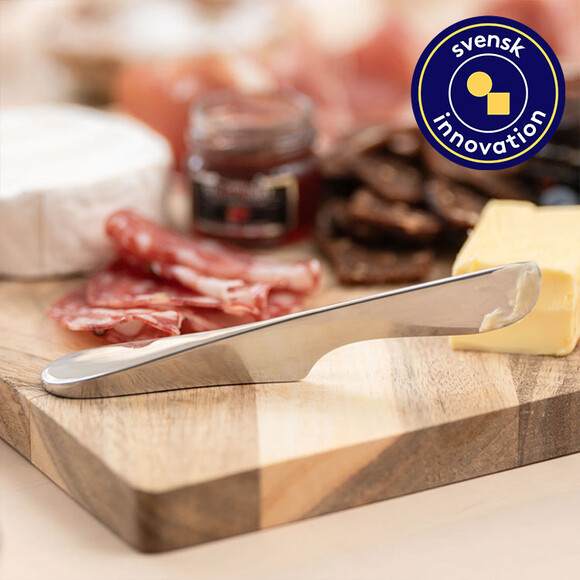 | | Den här smarta smörkniven är självskriven på vartenda delikatessbord. Kniven har en plan fot och ett upphöjt blad som gör att den kan stå för sig själv utan att kladda. |