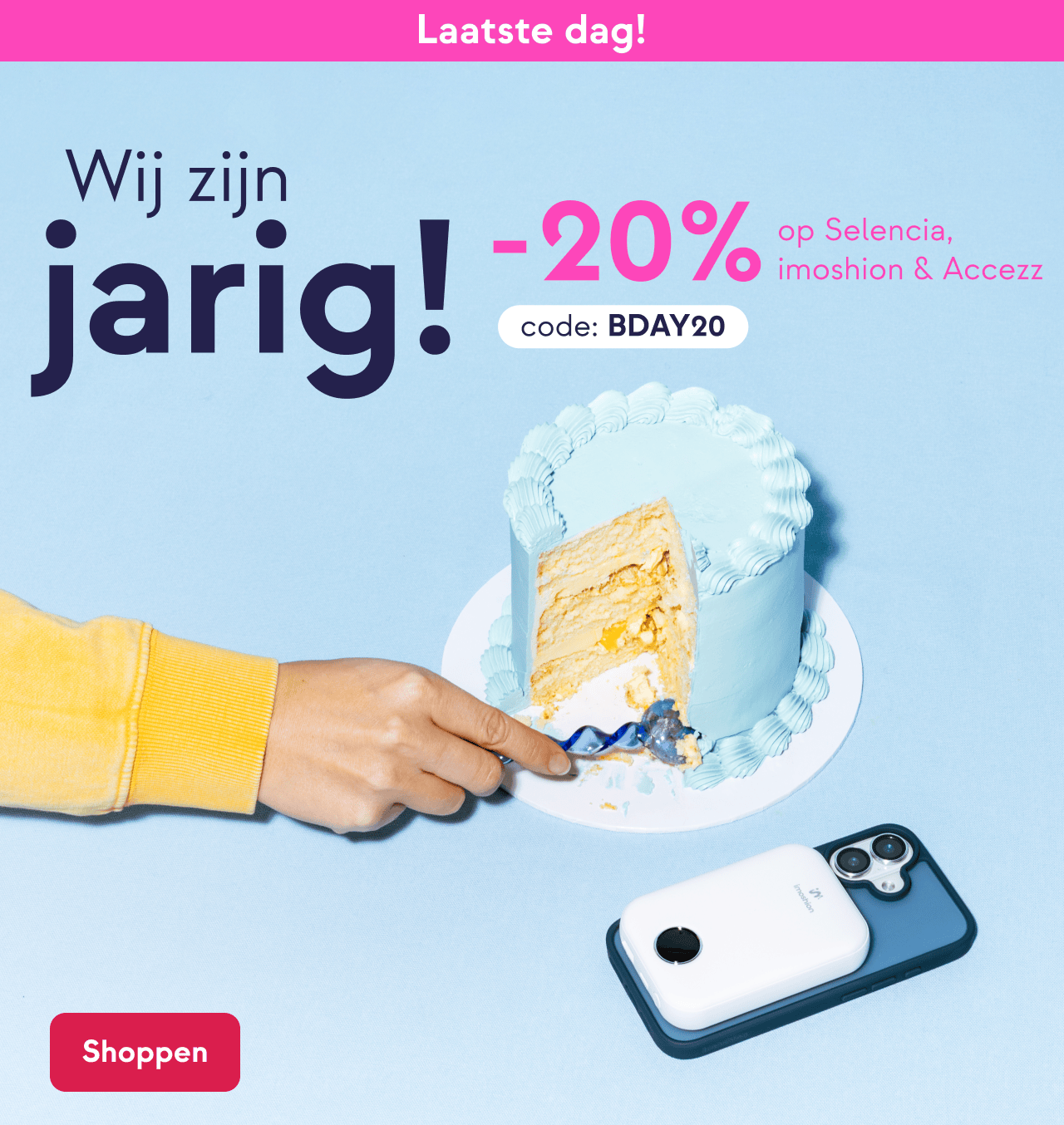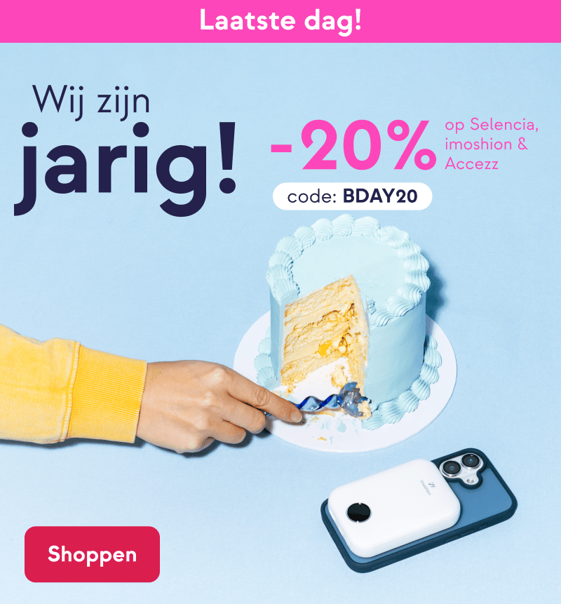 Shop alleen vandaag nog met 20% korting met de code BDAY20 op onze eigen merken imoshion, Selencia en Accezz voor jouw telefoon, smartwatch of tablet.