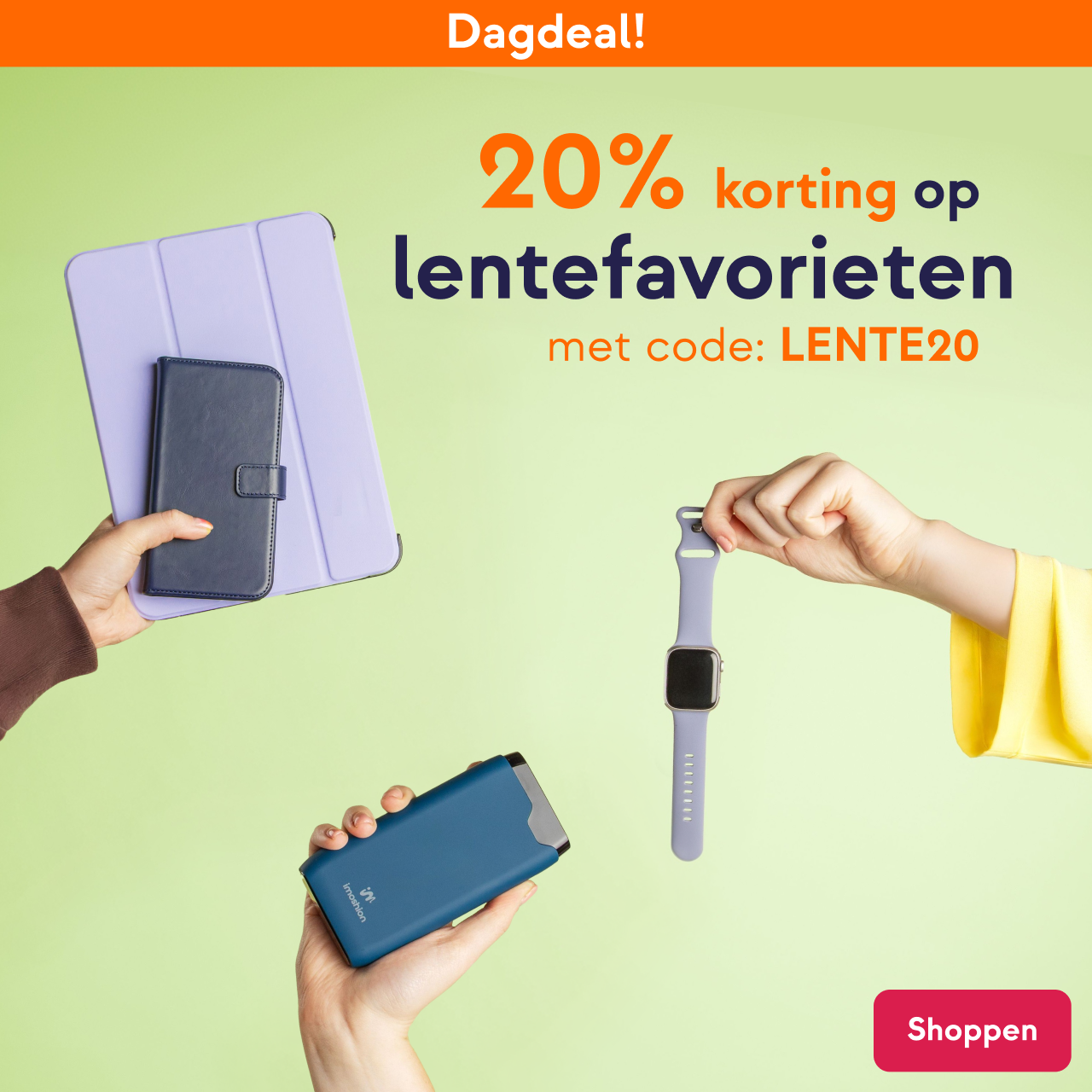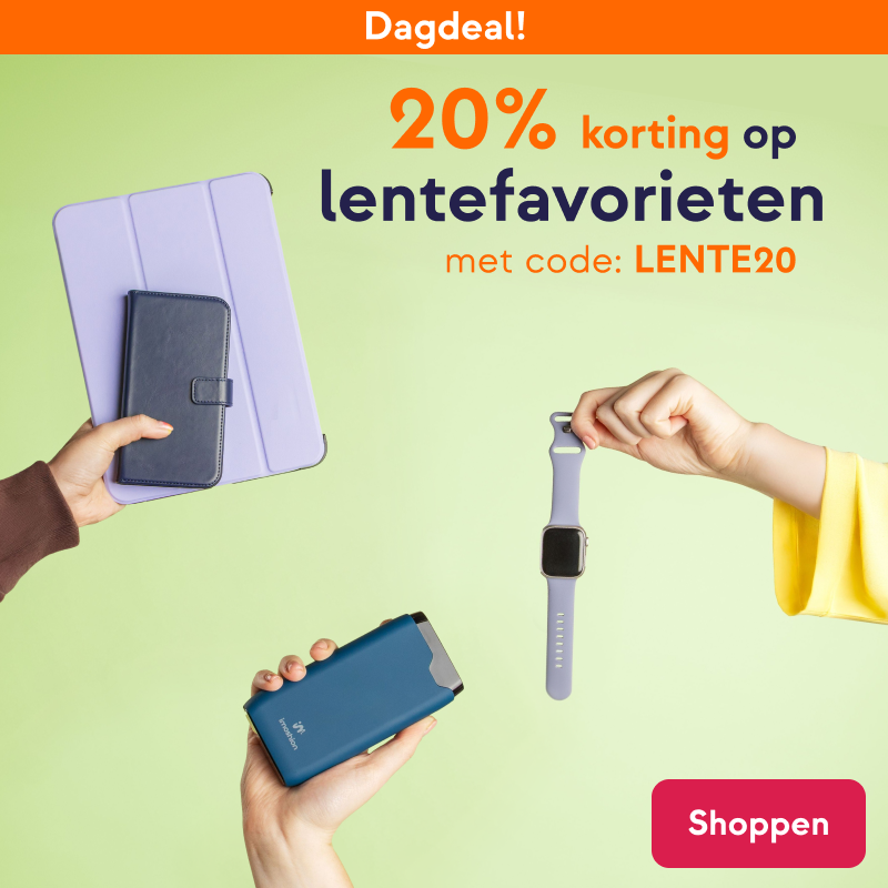 Van 20% korting op onze lente favorieten. Van bookcases tot powerbank of een nieuw smartwatchbandje, jouw telefoon, smartwatch of tablet kan wel een upgrade gebruiken! Gebruik de code LENTE20 en shop nieuwe favoriete accessoires.