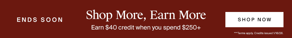 ***Promotional offer valid from 12/12/2025 12:01 am PT through 12/14/2025 11:59 pm PT. Earn $40 site credit when you spend $250-$499. Earn $80 site credit when you spend $500-$1,249. Earn $200 site credit when you spend $1,250-$2,499. Earn $500 site credit when you spend $2,500 or more. Qualifying order value is based on cumulative purchases in US dollars, net of discount, not including taxes, shipping, marketing site credits or purchases of gift cards during the promotional period. Credits will not be awarded for returned merchandise. Credits may be delayed for purchases with return requests created but returns not received. Limit one site credit per customer within the promotional period. Maximum credits issued not to exceed $500 USD. Credits issued by email on 1/16/2026 as a promotional code. Promotional code will expire five days from issue date. Code is valid on any item. Code may be split between multiple orders. Code does not apply to gift cards or shipping. Returned items originally purchased with the use of a code will result in the reactivation of the code, which will be valid for the following three days.