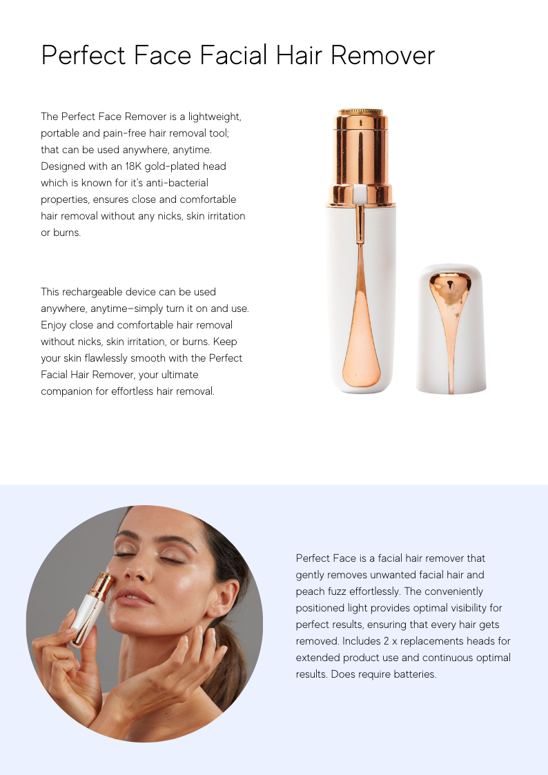 Achieve silky smooth skin instantly and painlessly with our Perfect Facial Hair Remover. Experience mess-free and painless hair removal with its lightweight, portable, and stylish design.