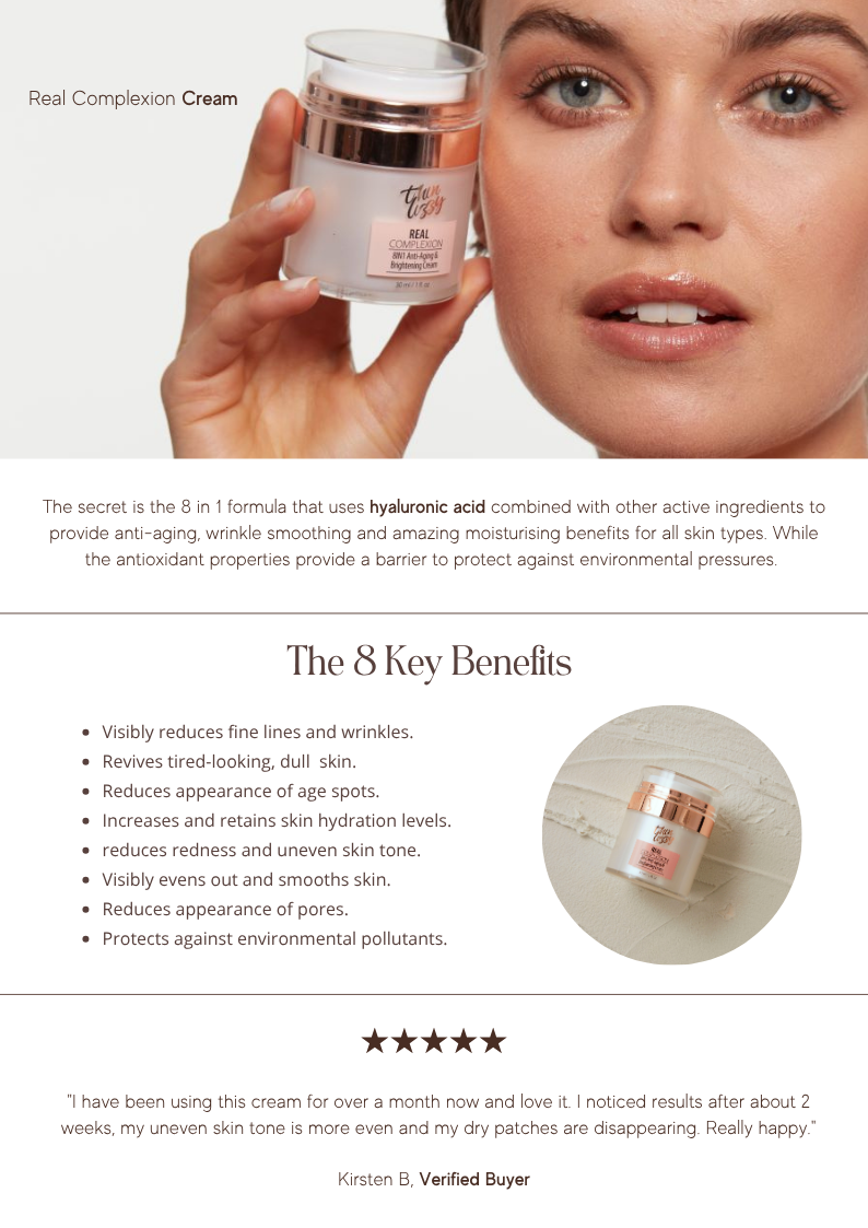 Meet the Real Complexion Cream, the skincare equivalent of a full-on glow-up. This isn’t your run-of-the-mill skincare product; it’s an 8-in-1 miracle that’ll make you wonder if you’ve been using the wrong stuff your whole life. If you’ve ever dreamed of a product that hydrates, brightens, and corrects, your dreams have come true...