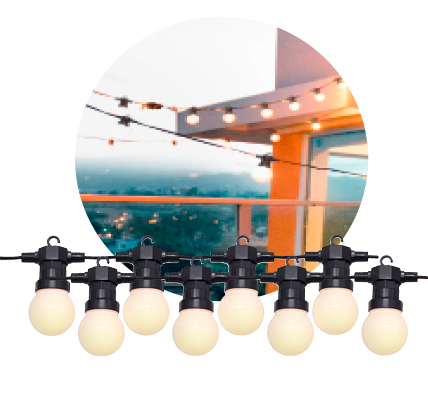 20 warmweiße LED-Leuchten, ø ca. 5 cm, IP44-Adapter, ca. 9,5 m + 3 m Zuleitung