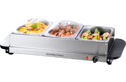Warmhalte-Temperatur 40°C bis 80°C, Sichtdeckel mit Löffelöffnung, auch als Warmhalteplatte einsetzbar, 200 Watt, 3 Warmhalteschalen à 1,5 Liter, ca. L 55 x B 15 x H 28 cm