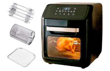 Touchdisplay, Temperaturbereich 80°C – 200°C, Timerfunktion, inkl. Backblech, Drehspieß, Entnahmewerkzeug und 2 Backroste, 1800 Watt, 12 Liter Volumen