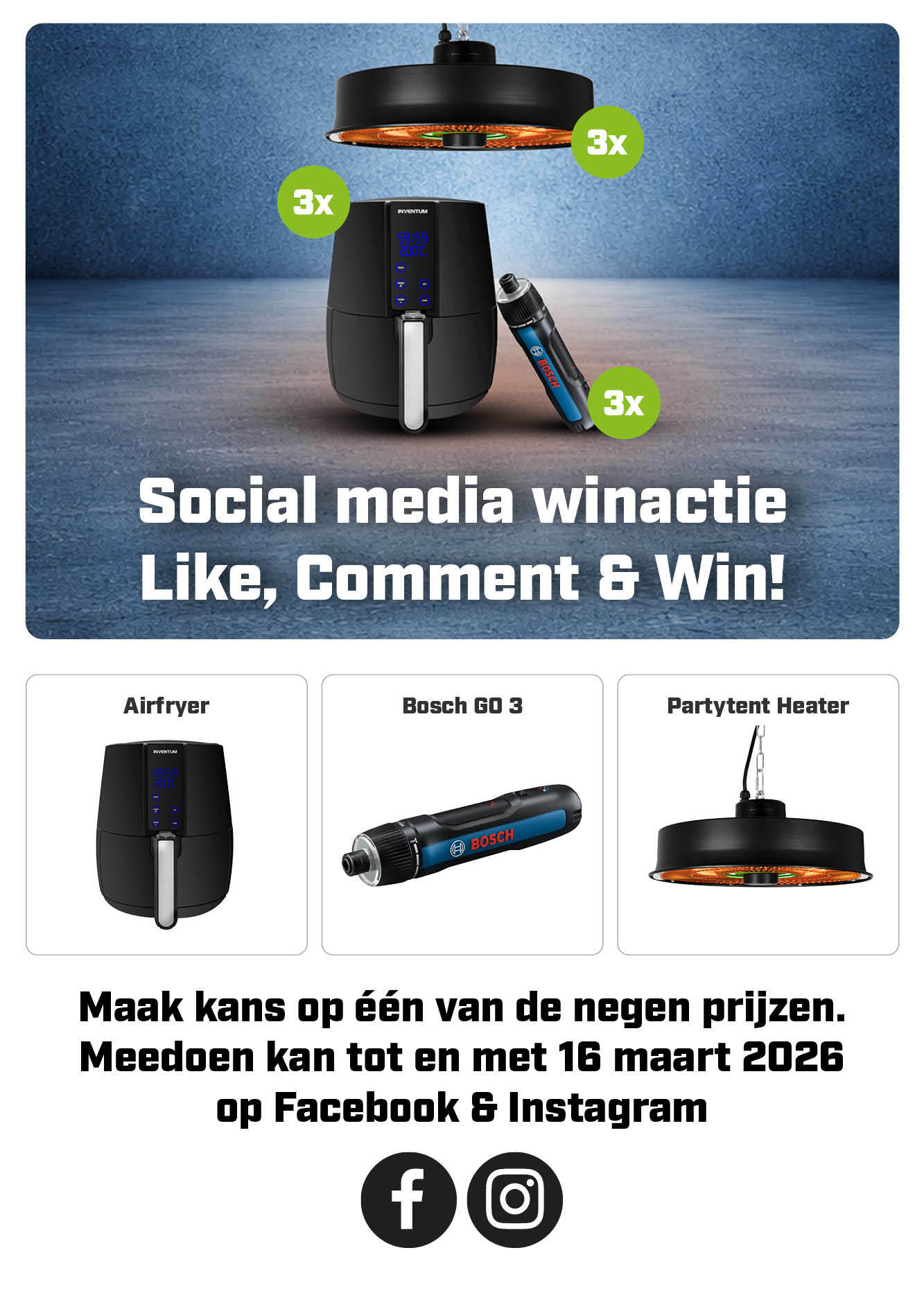 ⚡ Win een Bosch Go, Airfryer of Partytent Heater!