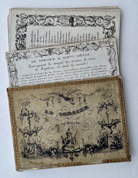 Sixteen engraved cards (92 x 124 mm), preserved in the original decorated moiree silk box, upper cover with elaborate illustration and gilt applique border, box a little dampstained and with some wear to extremities, cards printed within decorative border.