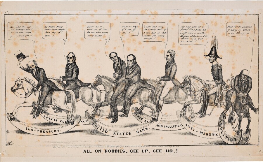 New York: H.R. Robinson, 1838. Oblong lithograph broadside, 11-1/2" x 18-3/4." "The major figures in American national politics in 1838 are gently satirized, each characterized as riding a favorite issue of 'hobbyhorse'."