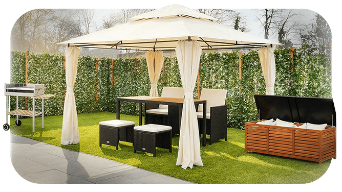 Turn your backyard into a dining spot for everyday use. Add an outdoor furniture set, shade it with a canopy or gazebo, and store essentials in outdoor boxes. Finish with lighting, rugs, and a grill for easy meals outdoors.