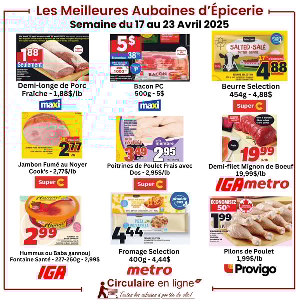 Toutes les Circulaires à portée de Clic! Magasinez les aubaines et promotions pour vos prochains achats afin d'économiser davantage Notre Sélection des Meilleurs Spéciaux dans les Circulaires de cette Semaine Recettes de Pâques | | Biscuits de Pâques au Sucre | | | | Les Nids de Pâques Moka Traditionnel | | | | Mousse de Pâques au Chocolat Blanc et Caramel | | | | Nids de Pâques en Panna Cotta | | | | Nid de Pâques au Biscuit Rose | | | | Gâteau Corbeille de Pâques Arc-en-Ciel | | Concours Populaires | | Concours CANAC 150 000$ en Argent - «GRIGNOTE, RAPPORTE, REMPORTE» | | | | Concours Fête Des Pères Gagnez une Carte Cadeau de 100$ Canadian Tire | | | | Concours Toiture dany gauthier - Gagnez une carte prépayée de 500 $! | | | | Concours Metro - Gagnez 1 des 3 cartes-cadeaux Metro de 500$! | | | | Concours Rouge 107,3 - Vivez une semaine tout inclus au Mexique en compagnie de Ben Gagnon ! | | | | Concours Gagnez votre spa de rêve avec Maître Piscinier d’une valeur de 5500$! | | | | Concours Aubainerie - Gagnez une carte-cadeau de 100$ ! | | | | Concours Gagnez du chocolat ou des fleurs! | | Nos Concours Exclusifs Vous pouvez participer chaque jour à tous nos concours! | | Concours Gagnez une Carte Cadeau Super C de 200$ | | | | Concours Gagnez cet Ensemble de Jardin | | | | Concours La Fête des Pères Gagnez une Carte Cadeau SAIL de 100$ | | | | Concours Gagnez une Carte Cadeau Walmart de 200$ | | |