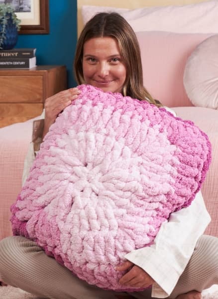 Bernat® Blanket Extra Thick™ Perfect Phasing™ makes color come alive on this plush crochet pillow.
